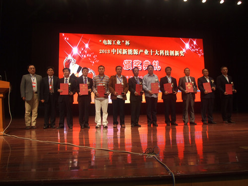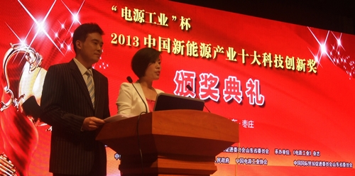 2013中國新能源產(chǎn)業(yè)十大科技創(chuàng)新獎頒獎典禮于10月19日在山東棗莊會展中心隆重舉行,工信部節(jié)能與綜合利用司資源綜合利用處處長黃健忠、棗莊市政府副市長張兵與中國電源工業(yè)協(xié)會理事長季國平、北京大學教授其魯分別向獲得十大科技創(chuàng)新獎及十大管理創(chuàng)新獎的企業(yè)或企業(yè)家頒獎。