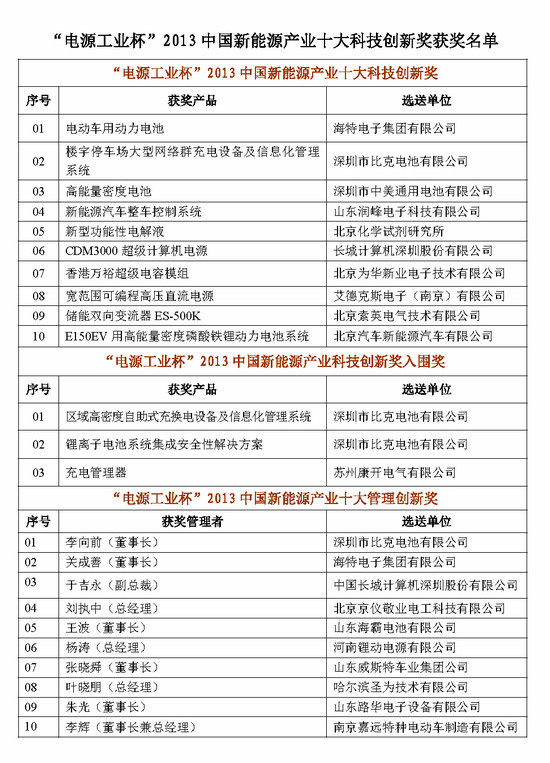 附:2013中國新能源產(chǎn)業(yè)十大科技創(chuàng)新獎獲獎名單